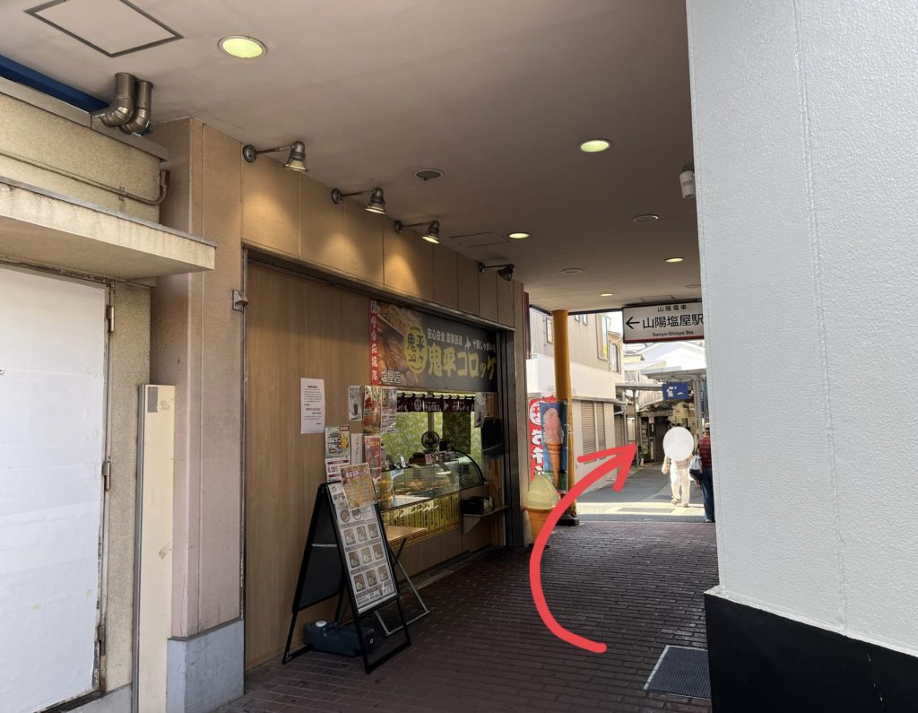 改札を出て右へ(北口)。階段を降りて右へ。左手に高架下のコロッケやさん「鬼平コロッケ」があります。正面の商店街へと進みます。(山陽塩屋駅からの行き方の次に続きます。)