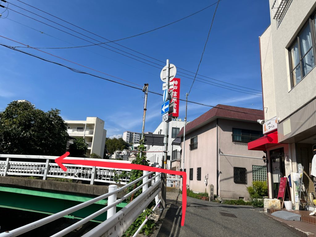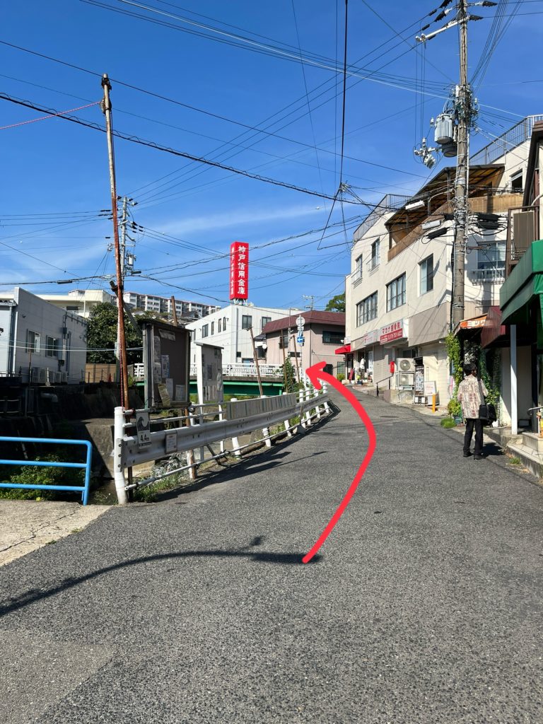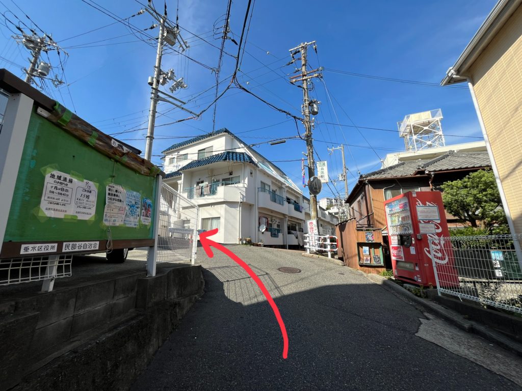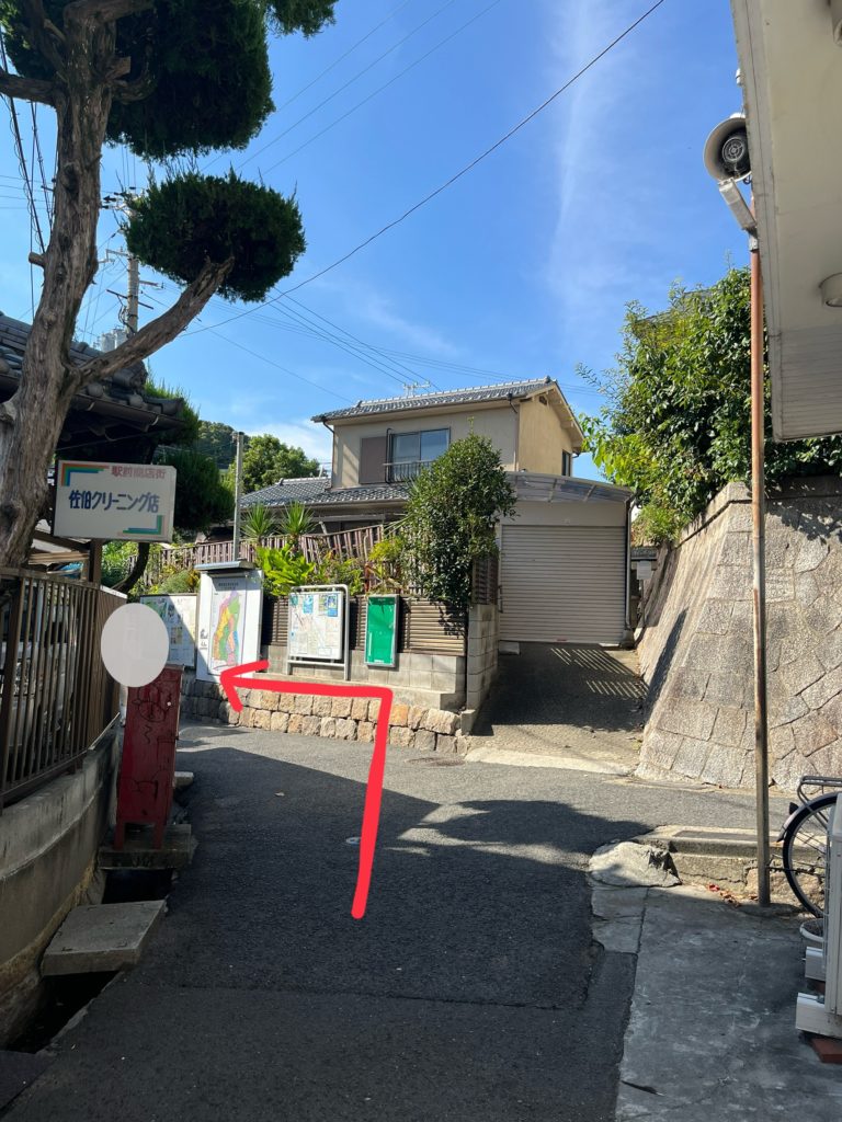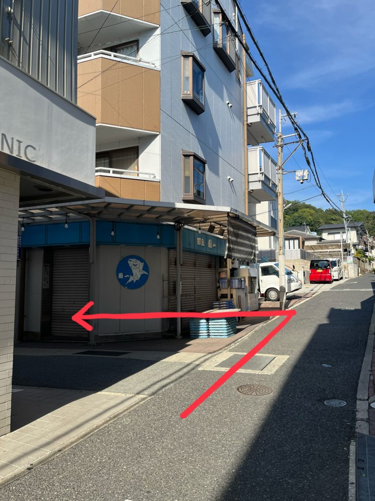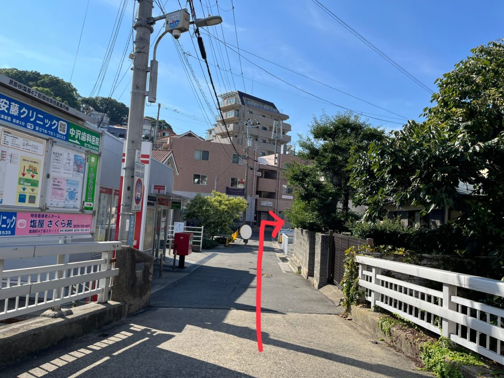 すぐの曲がり角(「魚一」さんの角)を左に入ります。(JR塩屋駅からの行き方と合流します)
