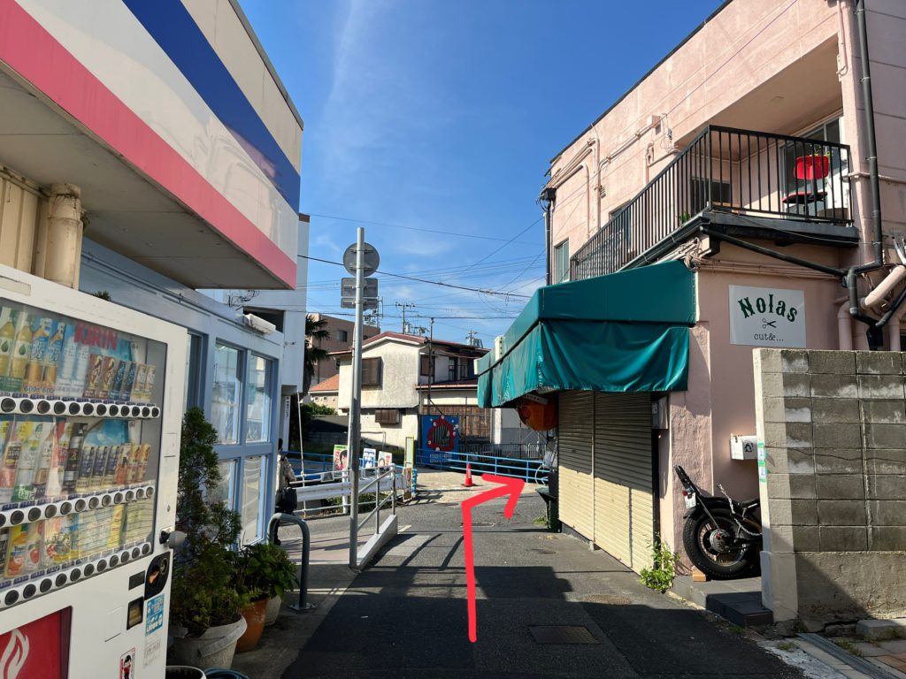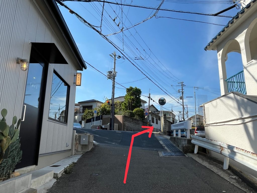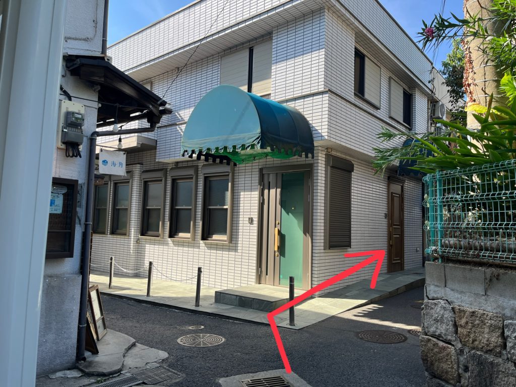 「海角」さんという素敵なお店の角があります。向かいの建物右側に沿って右に曲がります。