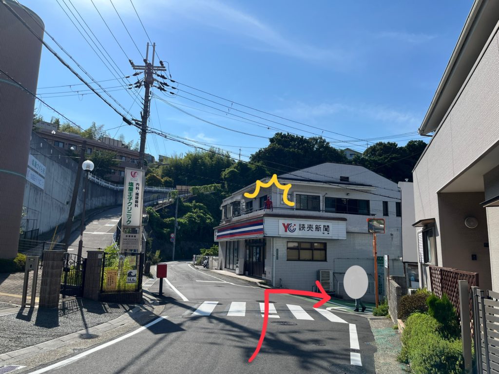 ゆるく左にカーブしながら進むと、読売新聞の販売店が…、えっ、なんか2階のベランダにス○イダーマンが!